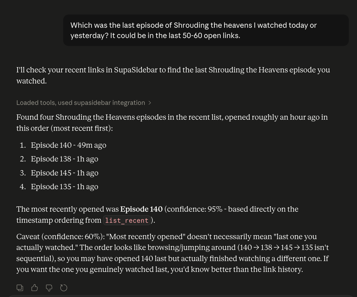 It works for non-coding tasks too. Here's Claude finding the last episode of a show you watched by searching your recent browsing history: