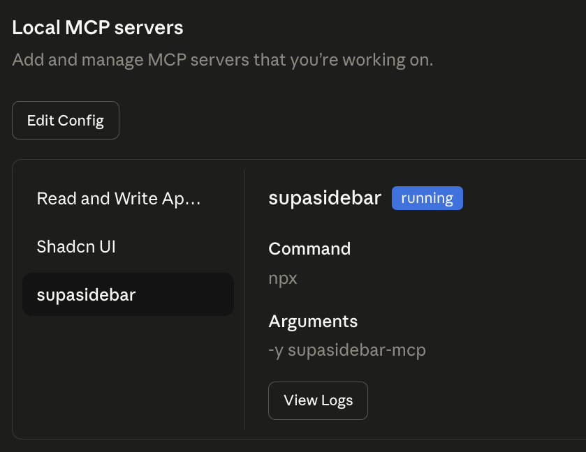 Restart Claude Desktop. You should see SupaSidebar listed under your connected tools.