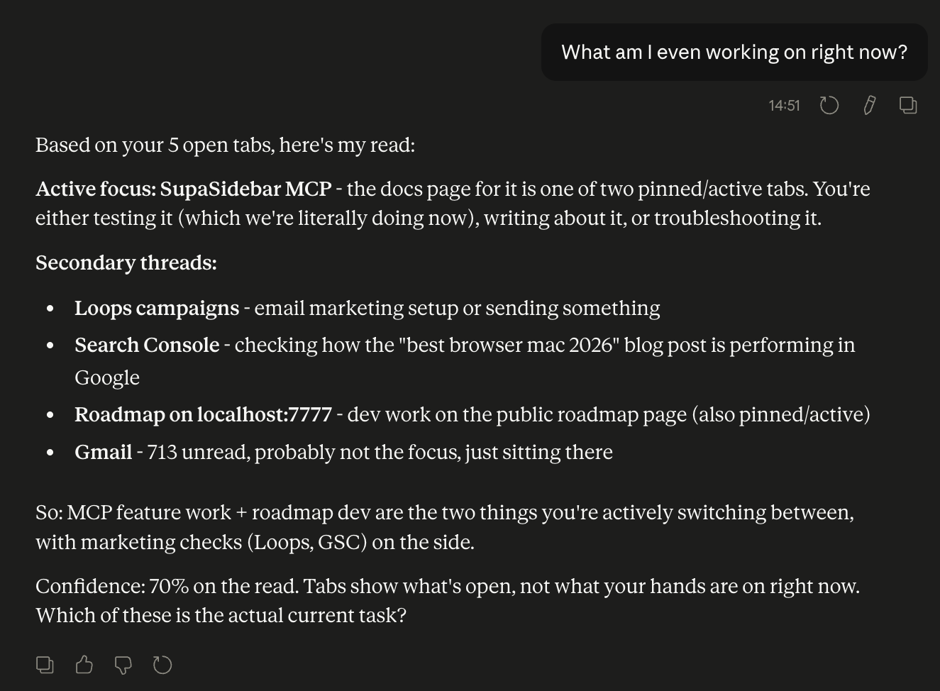 One thing worth mentioning: SupaSidebar's MCP server works on the Free tier. You don't need a Pro subscription for Claude to see your tabs.