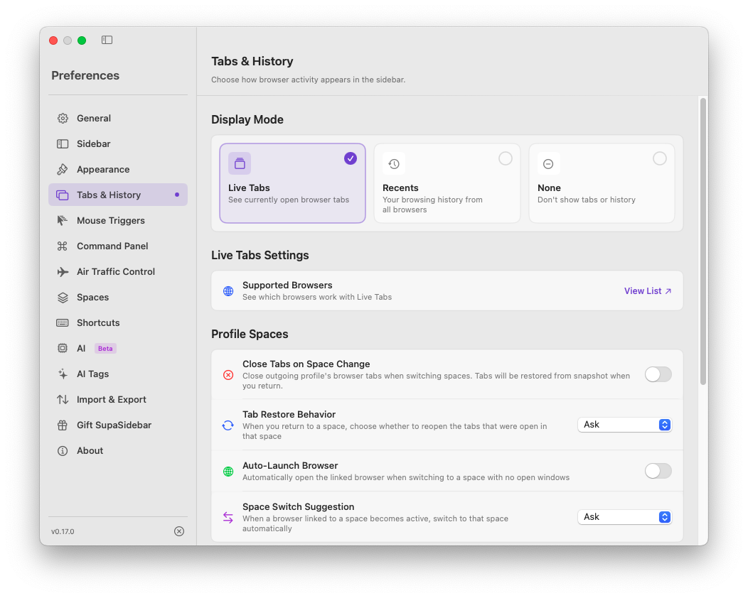 Open SupaSidebar (it lives in your menu bar). Go to Preferences > Live Tabs and make sure Live Tabs is enabled. This is what lets SupaSidebar see your open browser tabs.