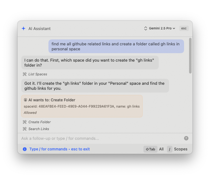 Manage your sidebar by talking to it. Tell it to create a folder, create a space, add a link, move items around, or set preferences. Instead of hunting through settings, just say what you want.