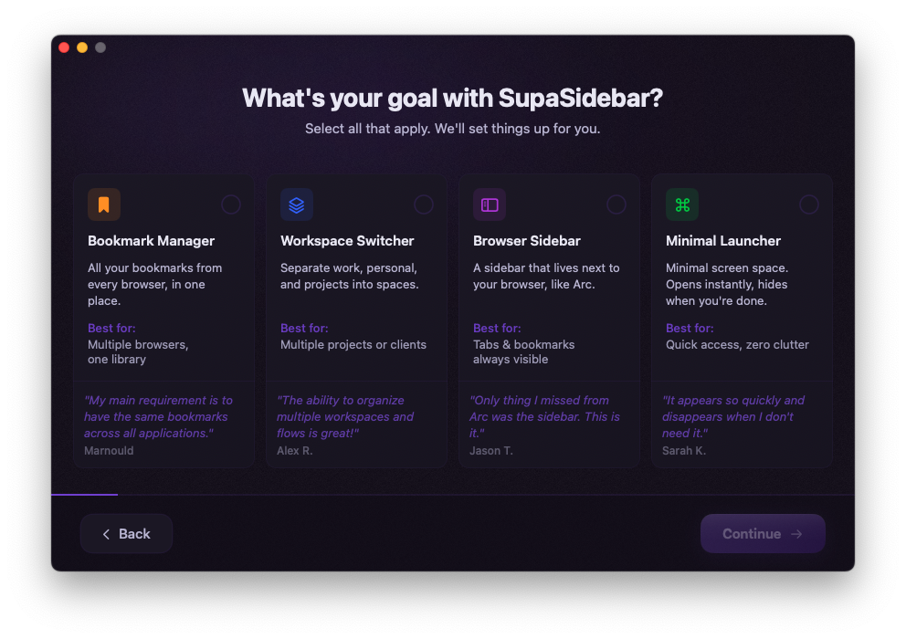 First, you pick what kind of experience you want - tab manager, bookmark manager, browser sidebar. Then it walks you through each setting one by one, and you can see what changes in real time as you toggle things on and off. By the end you have a sidebar that's set up for how you actually work, not a bunch of defaults you'll never touch.