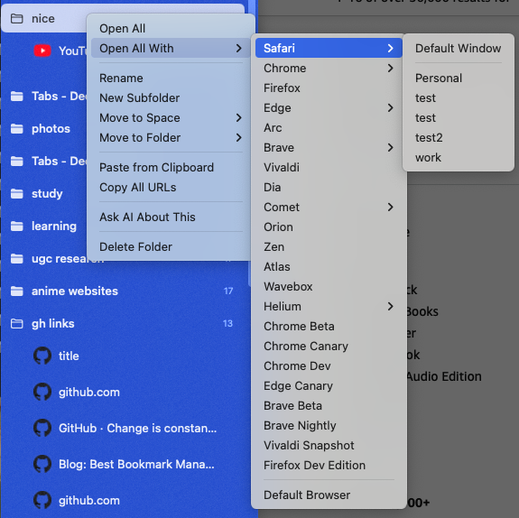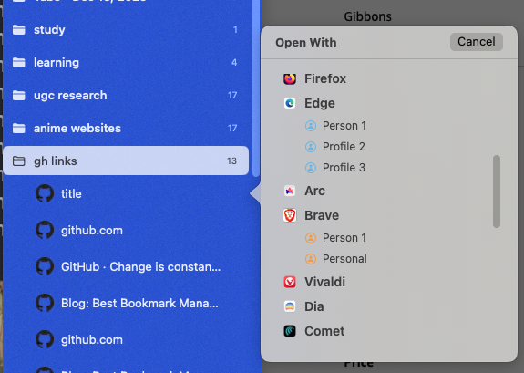 Open With menus now show browser profiles alongside browsers. Right-click a link, and instead of just "Chrome" you see "Chrome Work" and "Chrome Personal." Same for the Option+Click popover and the command panel.