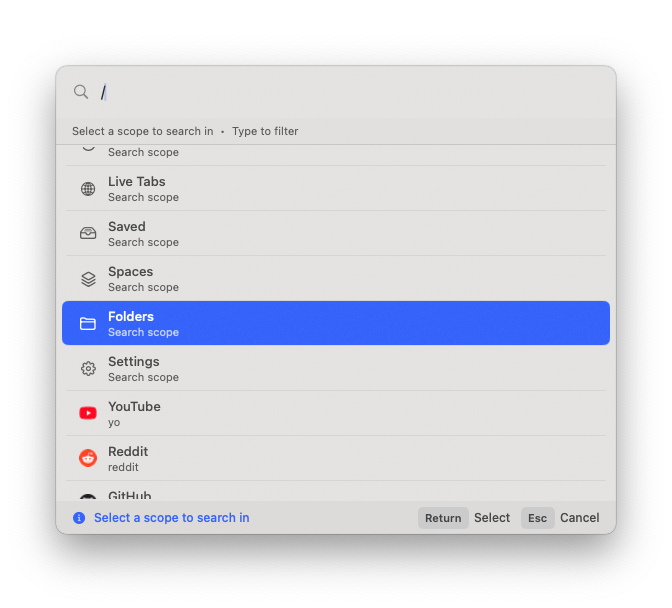 Use / to select scope. Press Shift+Tab to cycle through them, or type a slash command to jump directly to a scope. Saved links, recent items, live tabs, folders, settings, and more - each scope narrows your results instantly.