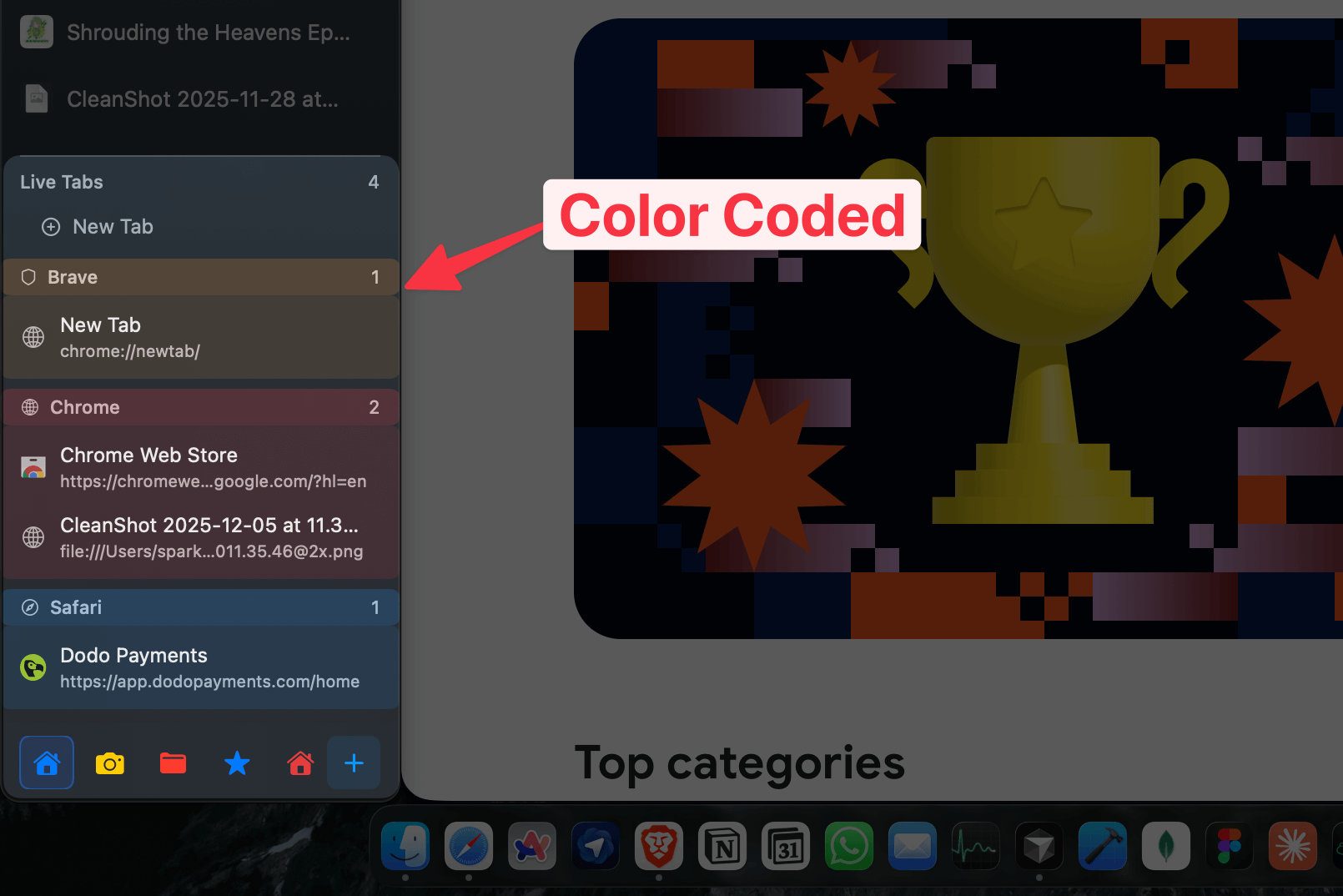 Tabs from different windows now have clear visual distinction with color coding. And live tabs show favicons, so you can scan and find what you need at a glance.