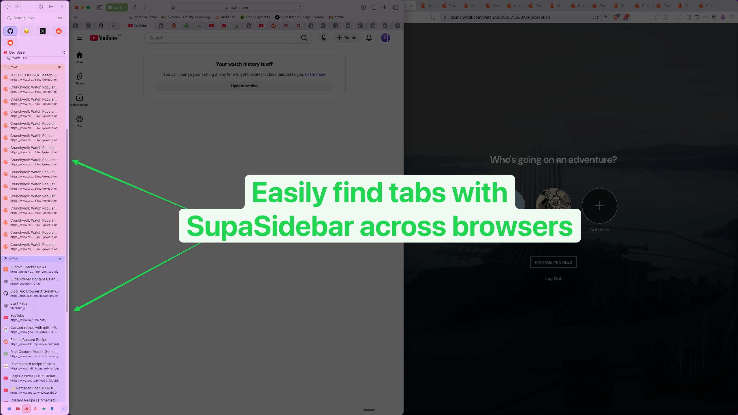 | SupaSidebar | Yes - 6 browsers | Yes - native Mac sidebar | Yes | Yes (fuzzy search) | Yes |