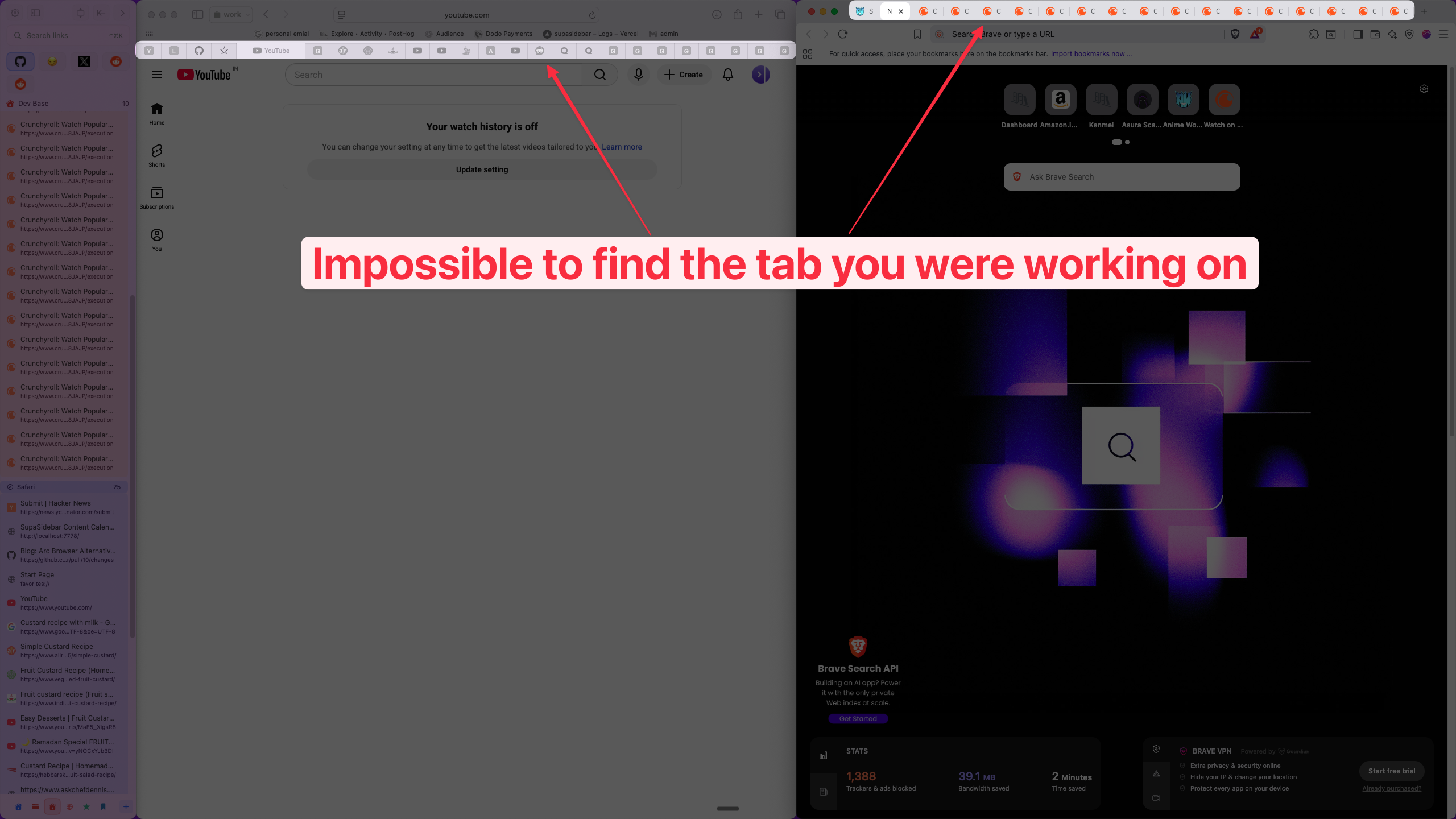 One sidebar, every browser. Your tabs from Safari, Chrome, Firefox, Brave, Edge, and Arc all appear in the same panel. When you're looking for that tab you opened earlier, you search once - not three times across three apps.